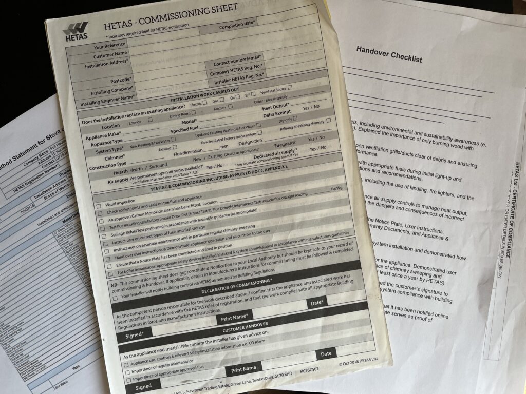 We’ll also walk you through the importance of annual sweeping and servicing by a competent person, recommended by HETAS at least once a year. Finally, we’ll issue your compliance paperwork and obtain your signature to confirm you understand the installation.